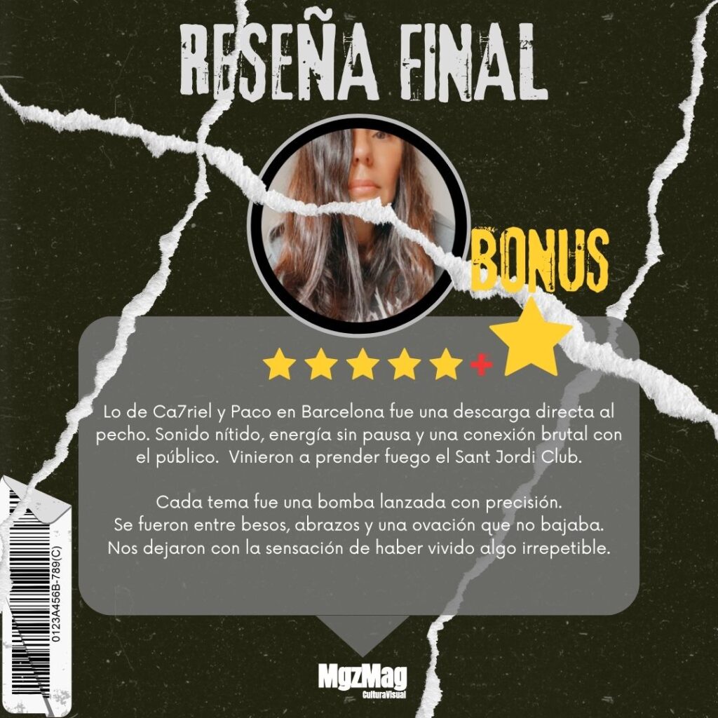 Todo estalló antes del primer beat. El Sant Jordi Club estaba lleno y el ambiente era intenso. Se notaba en las miradas, en los cuerpos apretados contra la valla, en cómo algunos se agarraban fuerte al móvil esperando el momento justo. Desde el primer segundo se sintió esa mezcla de ansiedad colectiva y energía contenida, como si todos supieran que estaban por ser parte de algo que no se repite. En el escenario, caras gigantes inflables con los rostros de Ca7riel y Paco Amoroso comenzaron a crecer, deformadas, grotescas y brillantes. Mientras tanto, apareció CHAD, la voz artificial que arrancó su monólogo hasta trabarse y volverse inentendible. Ese glitch forzado marcó el inicio oficial del show. El público soltó una risa nerviosa. Había empezado. Y ya no había vuelta atrás.