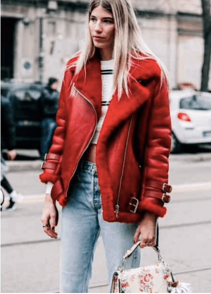 El modelo aviador es la última tendencia en camperas de cuero. Elegila en rojo para levantar cualquier outfit.