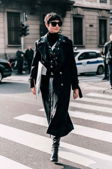 ¿Tu chaqueta de cuero tiene toda la onda pero te morís de frío? Sumale un tapado encima así la convertís en una capa más. Lo ideal es que el truco esté a la vista.