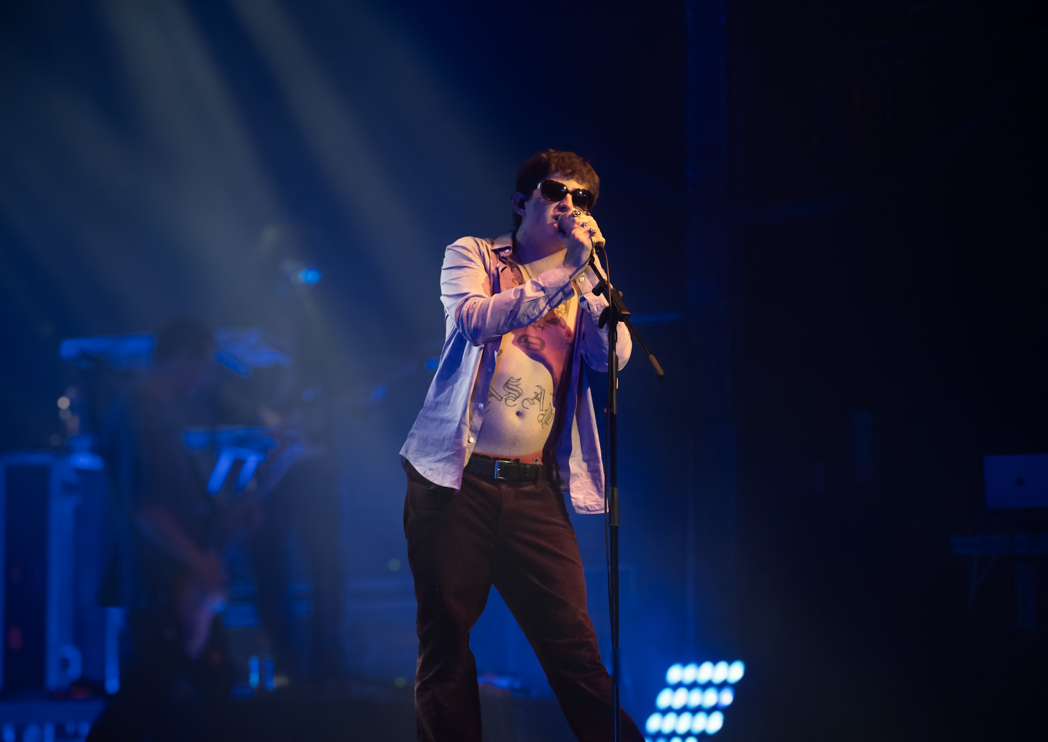En “Reality”, apoyado en la base rítmica de “Personal Jesus” de Depeche Mode, el tema gana cuerpo y se acerca aún más a un sonido post punk. Con esos ritmos marcando el pulso, se sube a la tarima de la batería, se quita el saco, se afloja la corbata y salta al frente. La base retumba con una contundencia que hace vibrar el suelo de Razzmatazz. “Piso 13” lo encuentra con la camisa abierta y la corbata suelta. En “Post Mortem” todo se ilumina en rojo. Está empapado. “Últimamente” construye una atmósfera espesa con bajo y percusión al frente. En “Muñecas” queda casi solo con la base rítmica, el grave hace vibrar el piso mientras el público sostiene el cántico.