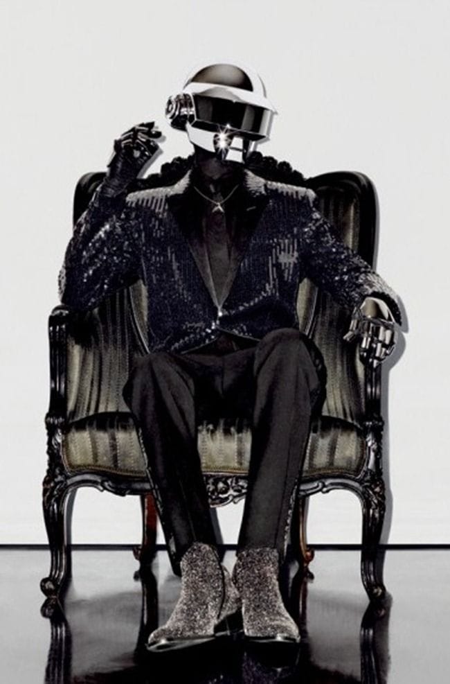 No era la primera vez que el trío galo unía su talento. El diseñador, empleado todavía en Dior, ya se había encargado de dibujar las chaquetas de cuero con tachuelas que los músicos habían llevado en su última gira de 2005, entre otras tantas prendas para otras cuantiosas apariciones públicas de la banda. En las imágenes de promoción de la firma los Daft Punk aparecen vestidos con un Smoking by Slimane de lentejuelas negras y los cascos y guantes que les definen, protegen y convierten en una especie de robots. Las fotografías formaban parte del ambicioso Saint Laurent Music Project, una serie de retratos realizados a los músicos favoritos de Slimane disparados por él mismo y que sirvieron para sentar las bases de su política en la empresa.