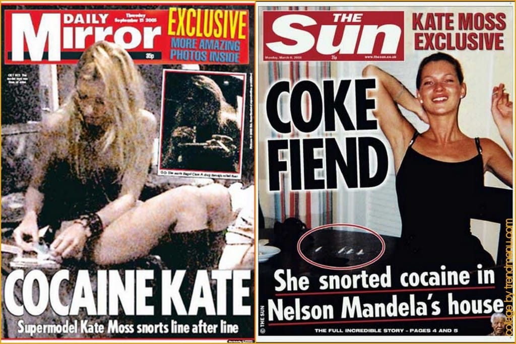 Sorprendentemente, la portada más impactante de Kate Moss no la dio Vogue, sino Daily Mirror. Las imágenes de Kate dibujando líneas blancas durante una sesión de grabación de los Babyshambles, el grupo de su novio por entonces, dieron la vuelta al mundo. Y aunque cuentan que el manager de Doherty fue el autor y distribuidor de las fotos, puede que a la modelo le doliera más el repudio de Chanel, H&M y Burberry. En cualquier caso, el escándalo atrajo firmas nuevas, como Yves Saint Laurent o Bvlgari, y una década después, la top vuelve a ser rostro de Burberry.