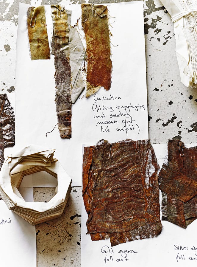 La elaboración de un traje varía según el tejido que se le asigne: unas veces es comprado y otras, creado para la ocasión. Por ejemplo el que se diseño para Los bravos se trata de una seda con una trama abierta, sometida primero a un proceso de oxidación natural y moldeada por calor. Después, se recubrió esta base con una pasta de óxido que permite plisar la seda introduciéndola en unos moldes realizados a mano. Así consiguió un efecto tridimensional. La creadora ha tenido que confeccionar más de 60 metros para poder vestir a todos los personajes. Hay un departamento entero solo para maltratar tejidos y dar aspecto de usado a los acabados de las prendas. El realismo que se busca lo requiere.