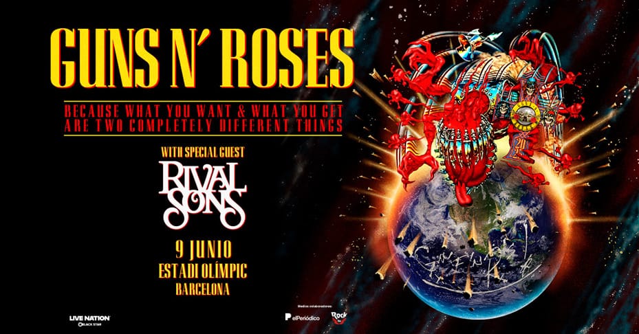Con más de 100 millones de discos vendidos, himnos eternos como Welcome to the Jungle, Sweet Child O’ Mine y November Rain, y una puesta en escena imbatible, Guns N’ Roses vuelve a encender los escenarios en una gira que recorrerá 24 ciudades y festivales internacionales. La parada en Barcelona será una de las más esperadas del tramo europeo y contará con la participación especial de Rival Sons, referentes del nuevo hard rock norteamericano.