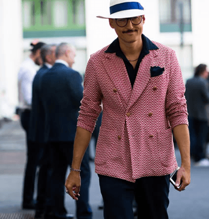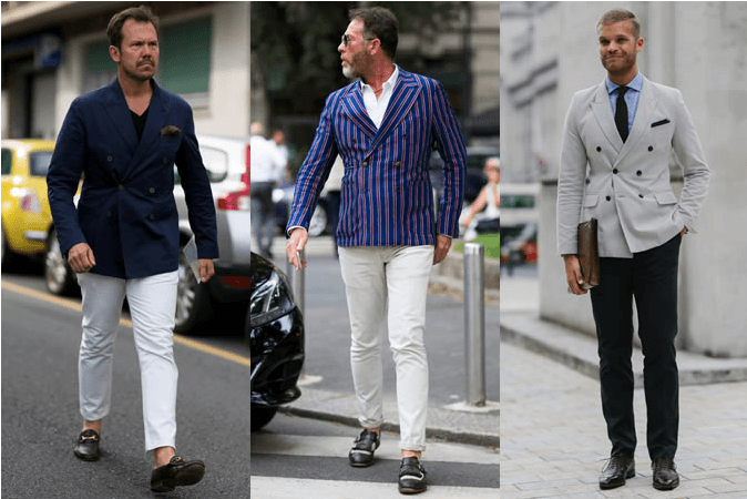 Lo habitual en Londres, la chaqueta cruzada (DB) todavía hacen sentir su presencia, con incondicionales del Street Style, desde diseños de lino en colores pastel con las versiones de rayas a la moda.