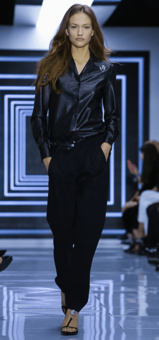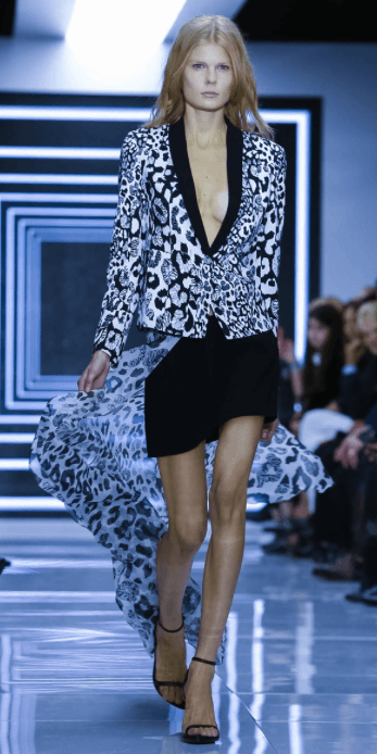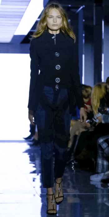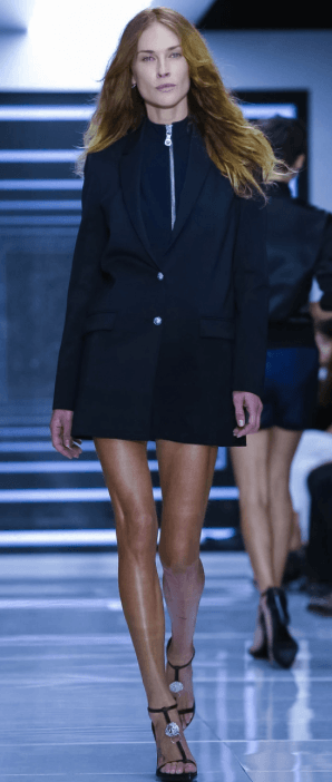 Camperas de cuero con tachas, «Versus» cinturones y zapatos de disco. Chaquetas de esmoquin fueron usadas sin aportar nada de nuevo como vestidos, satenes, y detalles en los botones propio del espíritu de Versus de Versace nuevamente en esta temporada. Negro sobre negro, bufandas de seda de leopardo, faldas asimétricas, Catsuits y túnicas largas fueron usados ??sobre los pantalones, jeans impresos y manchados de tinta, estampados florales negros. Versus actitud disminuida,un asalto comercial para una nueva temporada.