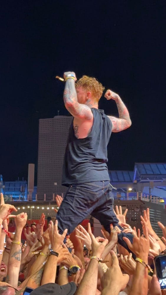 En Bodies, llegó uno de los momentos más épicos. Frank pidió al publico abrirse en dos y dejar un espacio. Y lo abrieron. Él se metió como si fuera parte del ritual, sosteniendo la jirafa en una mano, apretando el micrófono en la otra. Caminó entre cuerpos como un patriarca punk abriendo las aguas con su bastón de felpa. Fue salvaje, fue poético, fue punk. Y volvió entero, que no era poco.